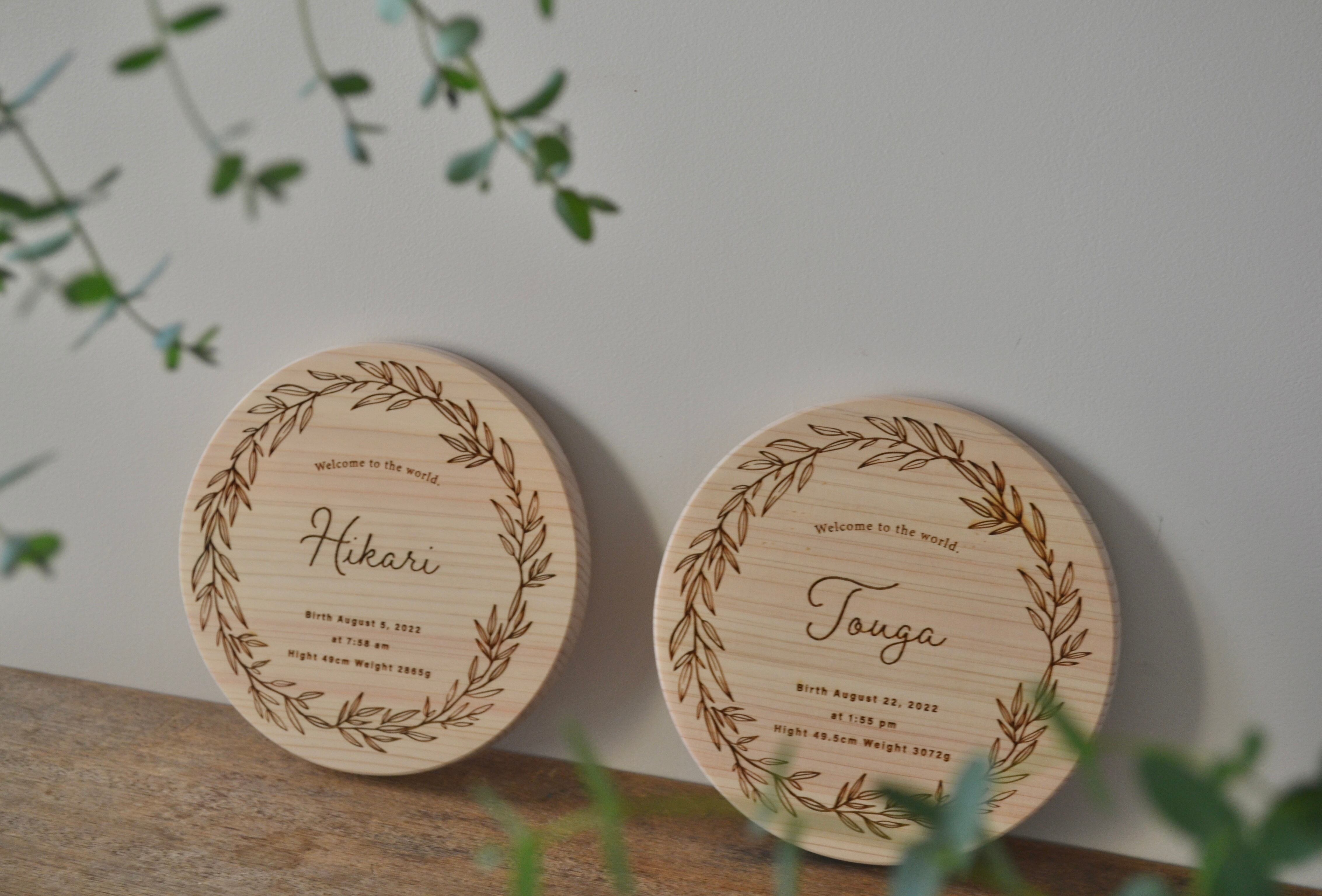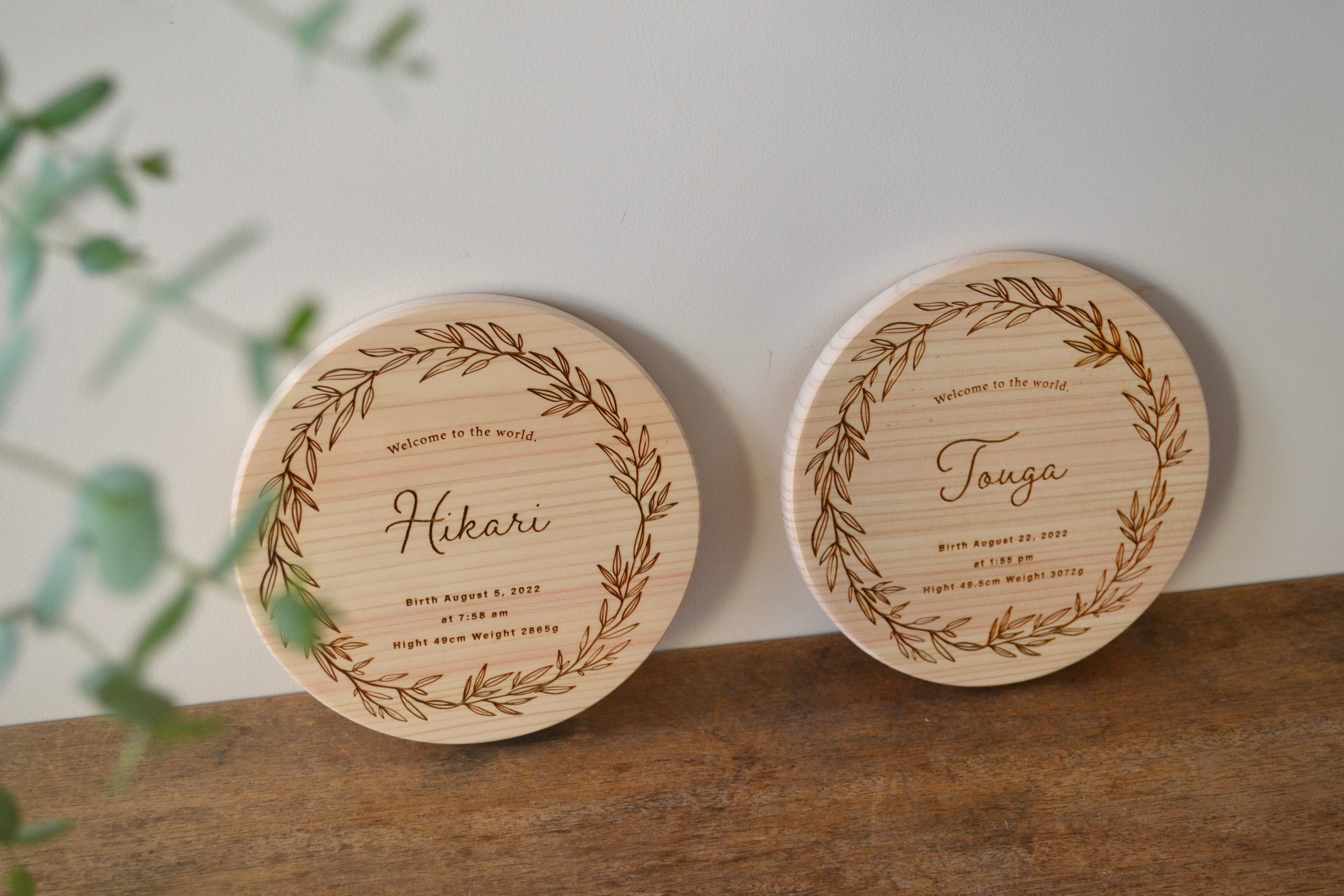 円形 リーフ 筆記体デザイン 【木製】バースボード 命名書 彫刻 出産祝い ニューボーン