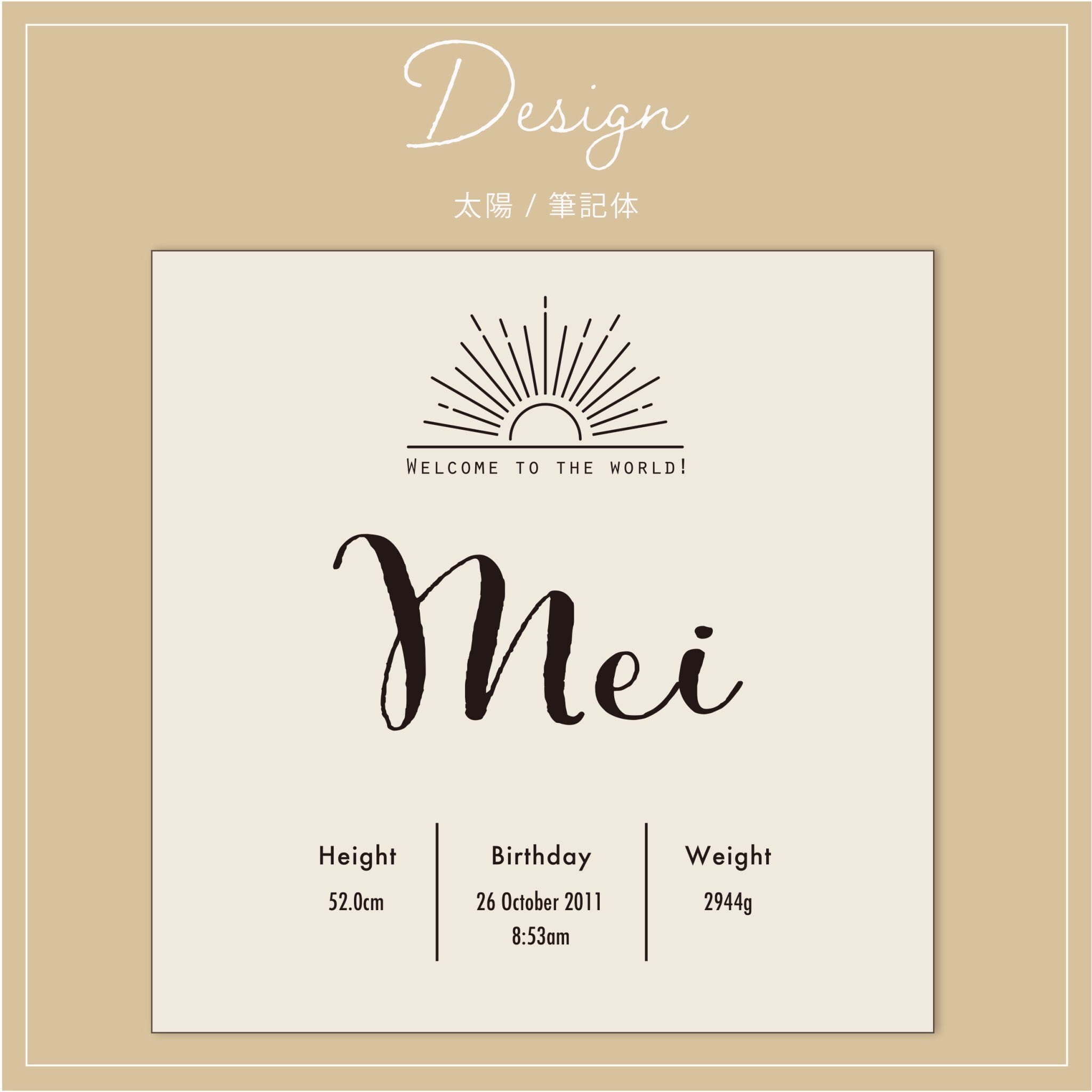 正方形/太陽/筆記体デザイン 【木製】バースボード 命名書 彫刻 出産祝い ニューボーン