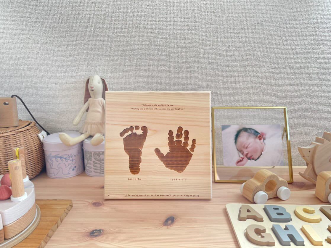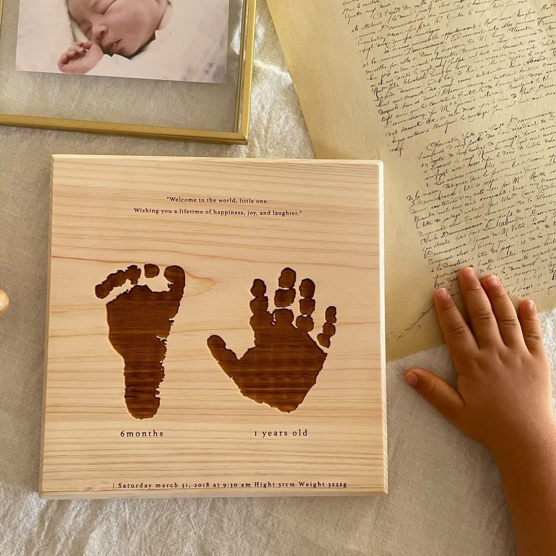 1人の足型・手型を一緒に彫刻できるデザイン、シンプルに一つだけ入ったデザインもございます♡